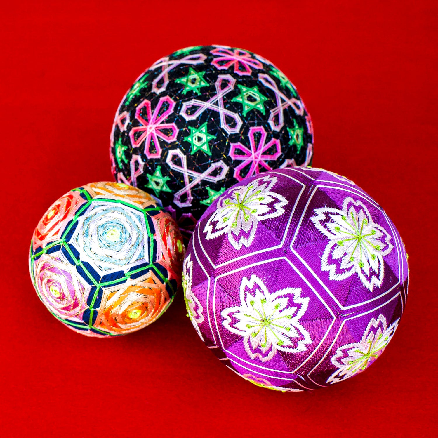 60年前に祖母から伝授された方法そのままに、鈴を入れたもみ殻を芯に、毛糸で巻き、更に糸を巻きつけた土台の上に手鞠専用の糸で模様をかがります。江戸時代は嫁入り道具の一つでした。万事が丸く収まるようご結婚の際、縁起物・魔除の贈り物として、重宝されています。